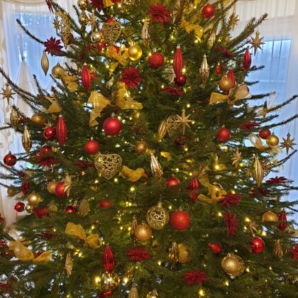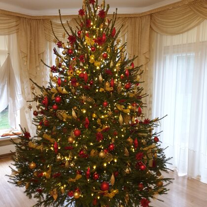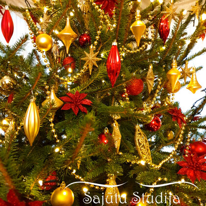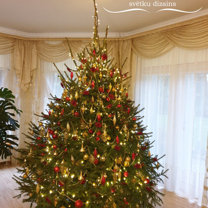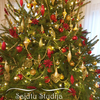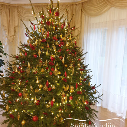 Ziemassvētku tradicionālās krāsas ir sarkans un zelts! Zelts rada svētku un greznības noskaņu, bet sarkans rada košumu un akcentu. Egli vēl krāšņāku padara zelta taureņi, kas salidojuši egles zaros. Aksesuāri – sarkanas un zelta bumbas, kā arī konusi. Papildus - lentas, pērļu virtenes, kas piedod eglei smalkumu, kā arī lampiņas.